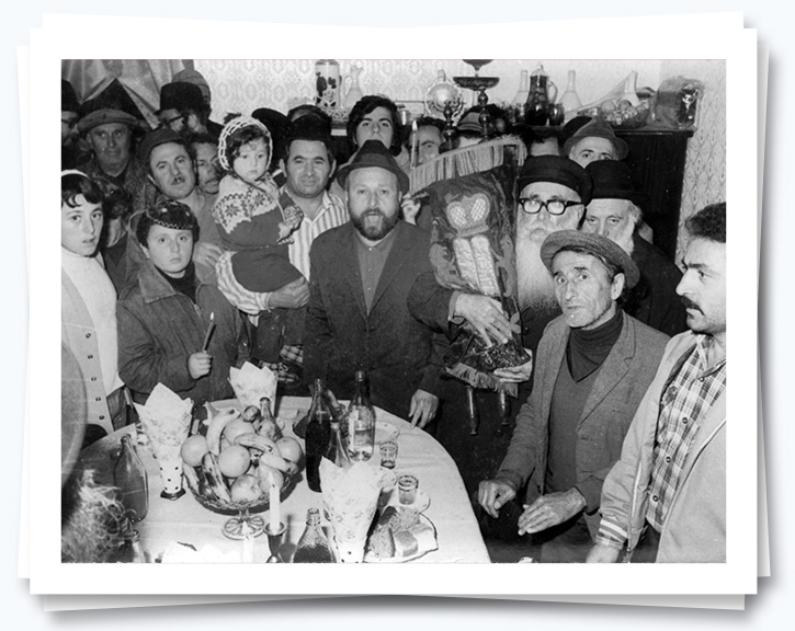 Раввины грузинской общины хахам Эммануэль и хахам Моше а-Катан на церемонии новоселья синагоги грузинских евреев и вноса свитка Торы - синагоги, построенной в иерусалимском квартале Катамон. Церемония состоялась в августе 1973 г. На снимке – хахам Эммануэль несет свиток Торы.